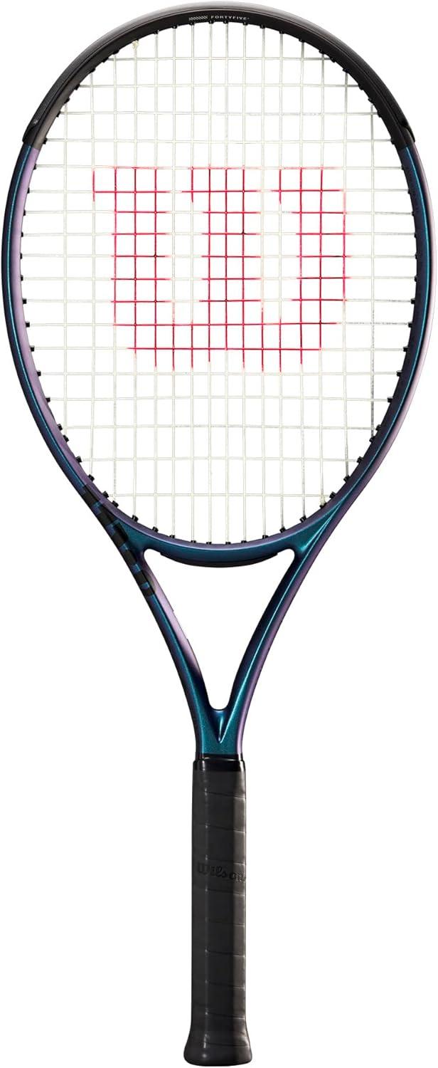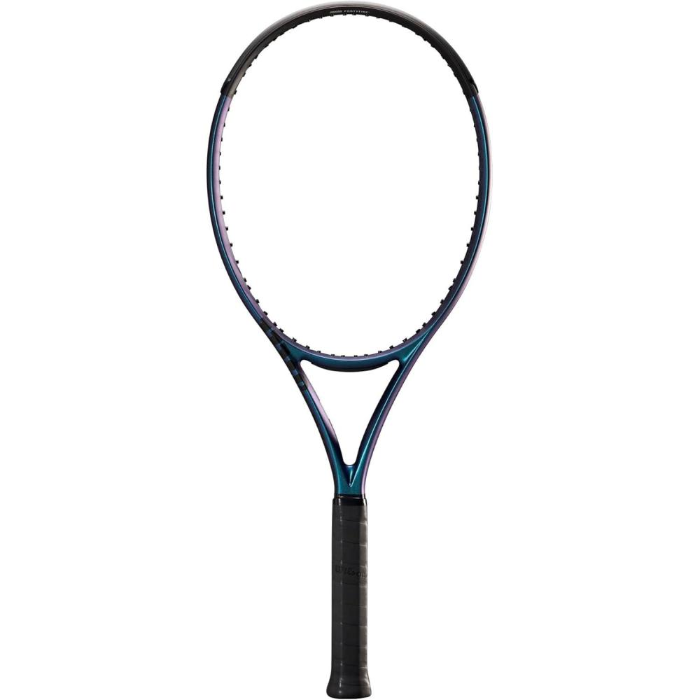 Loaded with a massive sweet spot in an arm-friendly composition, the Ultra 108 v4 arms users with a weapon that builds confidence and dazzles with every swing. Not only does this frame feature the largest head size of Wilson's key performance racket franchises for added power and forgiveness, it also strategically mixes in the groundbreaking FORTYFIVE° carbon construction into the lay-up for enhanced stability and comfort upon contact. Additional upgrades include an expanded Sweet Spot Channel for a boost of power, a sleeker geometry for more ergonomic-oriented comfort and a design that simply wows on the court with a matte finish featuring color-shifting blue tones.